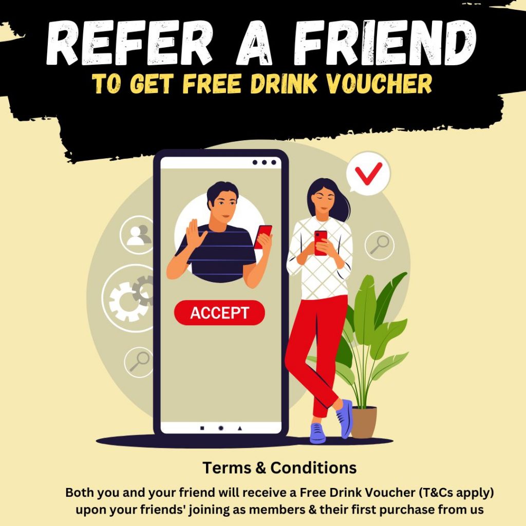 Both you and your friend will receive a Free Drink Voucher (T&Cs apply) upon your friends’ joining as members & their first purchase from us.